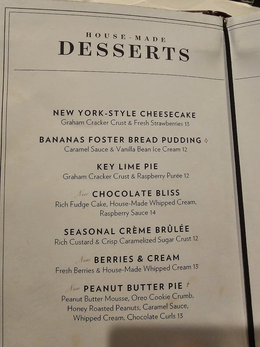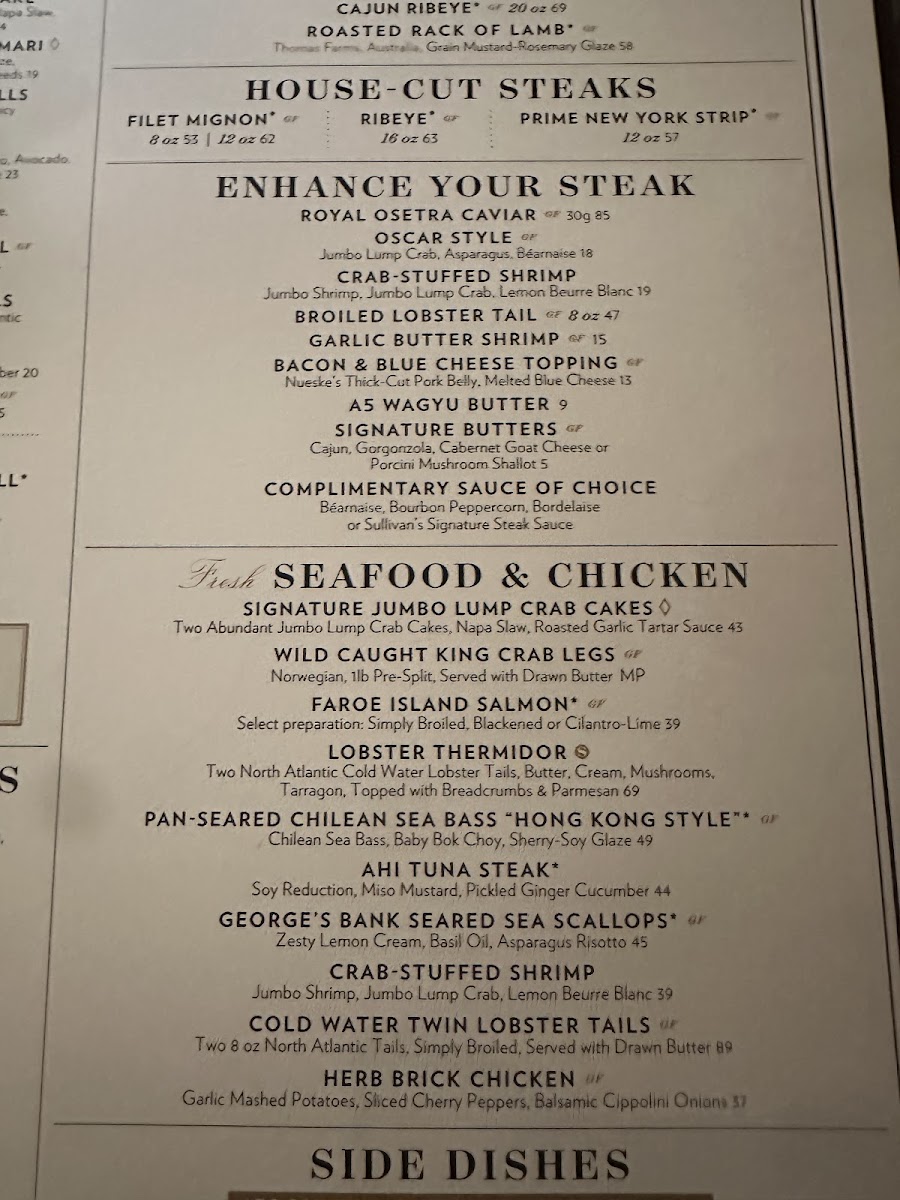 Start your meal with shareable options like Beef Wellington Bites or Oysters Rockefeller, perfect for settling in and enjoying conversation. The steak offerings, including cuts like Ribeye and Filet Mignon, are at the heart of the menu, providing a rich and timeless dining experience that pairs well with sides such as garlic mashed potatoes or sweet potato casserole.